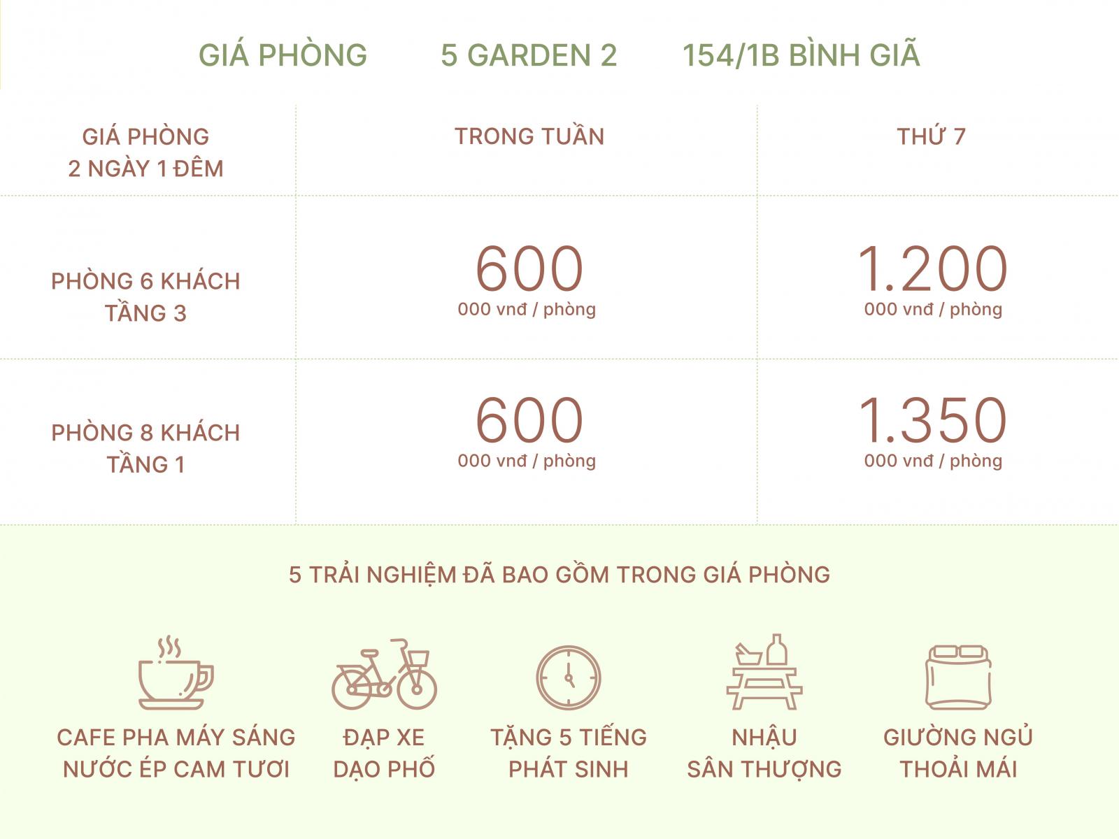 5 garden 2 không có bồn gỗ ngâm thảo dược, tuy nhiên, các tiện ích khác như cafe pha máy sáng, nước ép cam, xe đạp sử dụng từ phía 5 garden 1. Được tặng lên tới 5 giờ (nhận phòng sớm hoặc trả phòng trễ, áp dụng khi phòng trống).